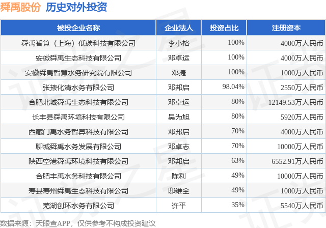 本站消息,根据天眼查APP显示,舜禹股份(301519.SZ)新增一起对外投资事件,被投资公司为舜禹智算(上海)低碳科技有限公司,法定代表人李小格,投资占比为100%。该公司从事软件和信息技术服务业,注册资本为4000万人民币。目前匠心智策,舜禹股份共存在对外投资12项,详见下表: