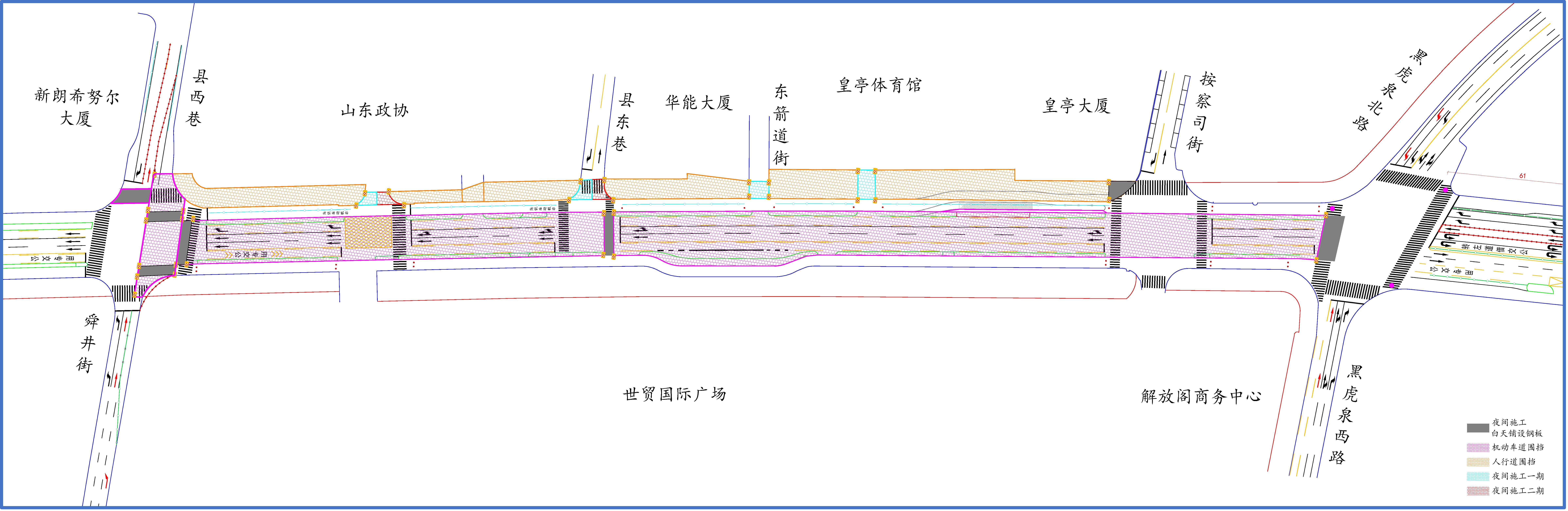 泉城路(县西巷-黑虎泉北路)机动车道及北半幅人行道进行封闭施工。施工期间,请过往机动车绕行,东向西行人和非机动车在北半幅非机动车道通行,西向东行人和非机动车正常通行;施工路段禁止机动车借非机动车道通行(特殊车辆除外),沿线单位出入口进行夜间施工,白天铺设钢板保障行人和非机动车正常进出。