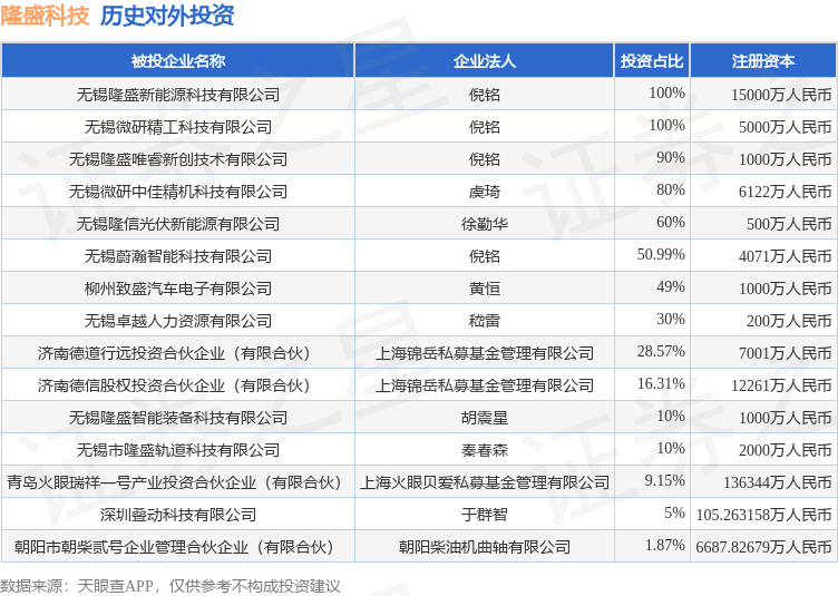 本站消息广证策略,根据天眼查APP显示,隆盛科技(300680.SZ)新增一起对外投资事件广证策略,被投资公司为无锡隆信光伏新能源有限公司,法定代表人徐勤华,投资占比为60%。该公司从事电力、热力生产和供应业,注册资本为500万人民币。目前,隆盛科技共存在对外投资15项,详见下表: