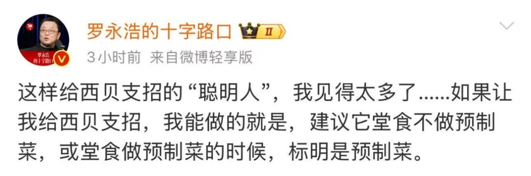 随后甚至给西贝支招:“建议它堂食不做预制菜,或堂食做预制菜的时候,标明是预制菜。”