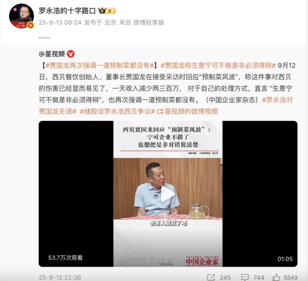 罗永浩再发文:我感觉到贾老板是真心想把西贝搞死