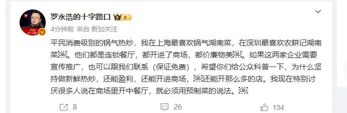 昨晚下播后,罗永浩再次发文:平民消费级别的锅气热炒,我在上海最喜欢锅气湖南菜,在深圳最喜欢农耕记湖南菜。